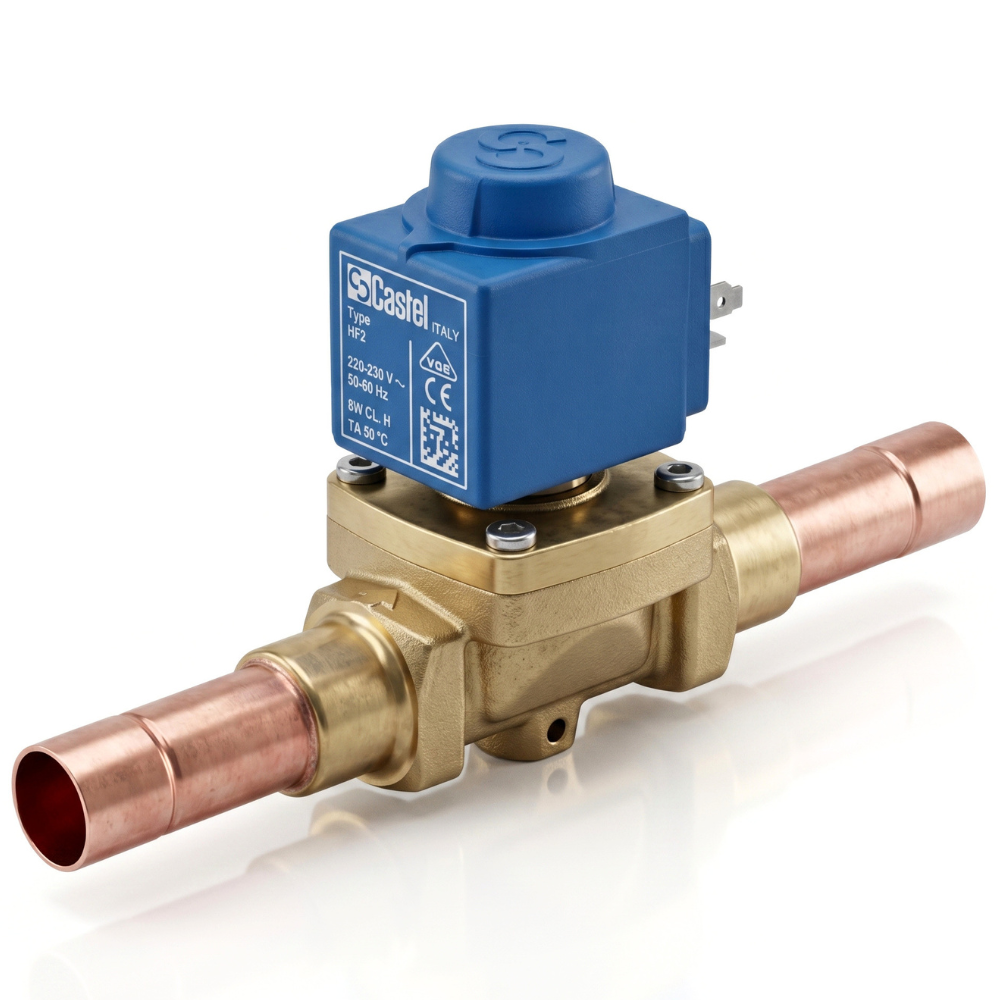 The Castel 1078/5A6 Solenoid Valve is a high-performance refrigeration valve designed for HVAC and cooling systems. It operates using a diaphragm (membrane) pilot-operated mechanism, ensuring smooth and efficient control of refrigerant flow.