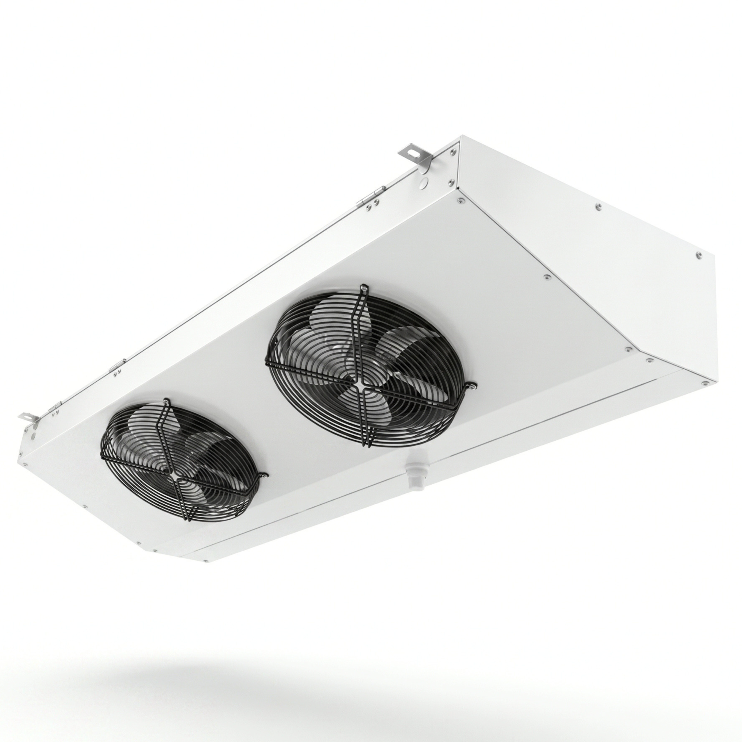 The unit is equipped with 2 × 300 mm axial fans operating at 1500 rpm, delivering approximately 2070 m³/h airflow with an air throw of up to 16 meters, ensuring uniform air distribution across small to medium cold rooms.