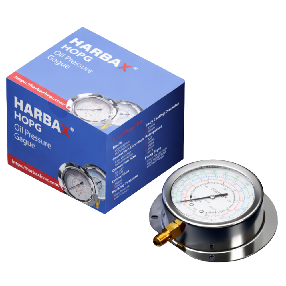 The HARBAX HOPG-60mm Oil Pressure Gauge is a reliable HVAC and refrigeration pressure monitoring instrument designed to accurately measure oil pressure up to 550 PSI. Built for durability and precision, this gauge features a bottom connection with 1/4″ SAE fitting, making it suitable for professional service and industrial applications.