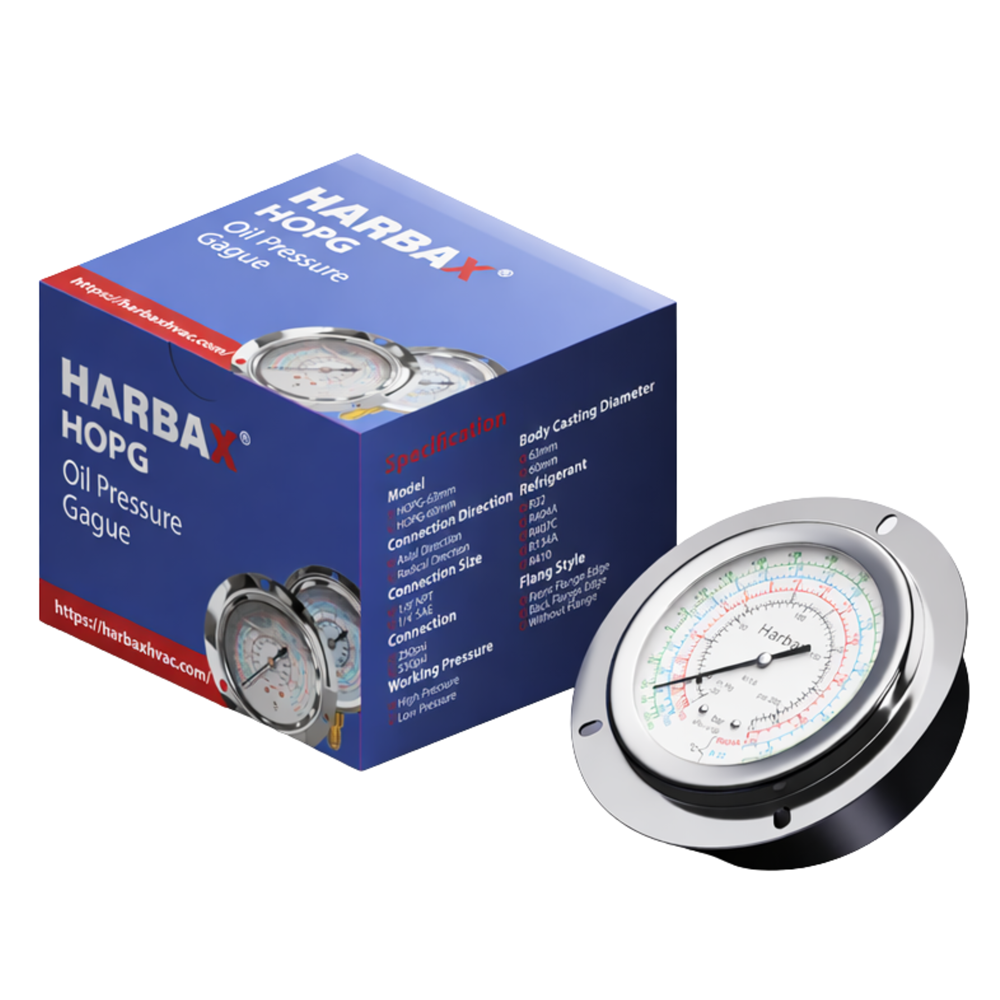 The HARBAX HOPG-63mm Oil Pressure Gauge (High Pressure) is a reliable HVAC and refrigeration measurement instrument designed to accurately monitor oil pressure up to 550 PSI. This gauge is ideal for systems operating under higher pressure conditions, helping technicians ensure safe and efficient performance.