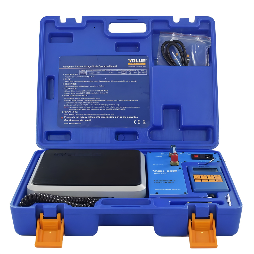 The VES-50B Electronic Refrigerant Scale by VALUE is a compact and high-precision tool designed for accurate refrigerant charging and recovery in HVAC and refrigeration systems. With a 50kg capacity, it is ideal for standard refrigerant cylinders used in residential and light commercial applications.
