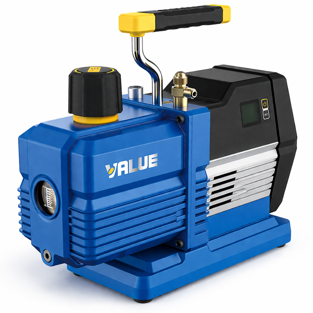 The VRP-6DI from Value is a smart digital dual-stage vacuum pump designed for professional HVAC and refrigeration servicing. It is suitable for system evacuation, moisture removal, and deep vacuum generation in systems using modern refrigerants such as R32 and R1234yf.
